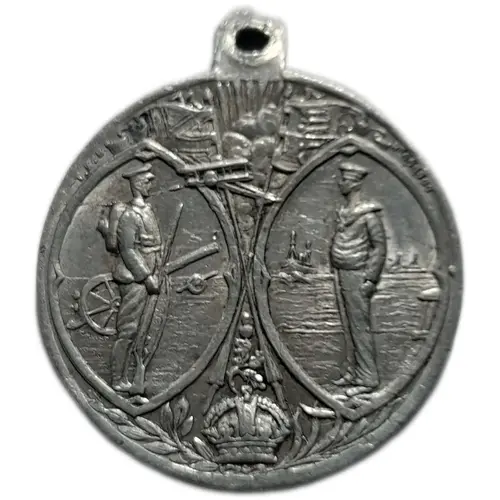 | Obverse description | Two ovals, on left a soldier stands facing right with field guns behind. On right a sailor stands facing left with warships behind. At top, Union Flag to left and Royal Standard to right, with radiant sunrays and clouds between with a biplane. At bottom, crown with crossed flagpoles and laurel and palm sprays. |