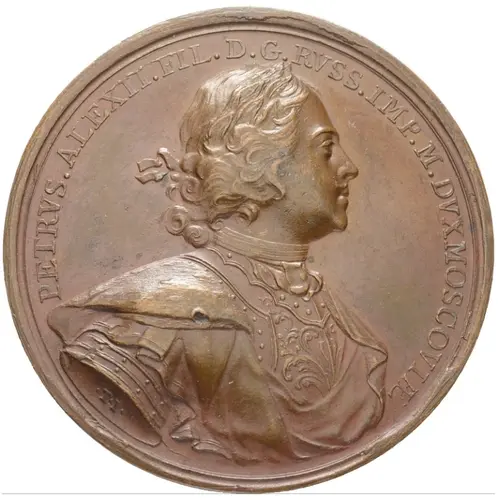 | Reverse description | Minerva and Mercury sitting on a cloud, supporting a medallion with the portrait of Peter I. |