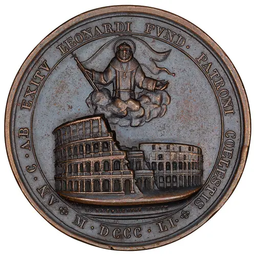 AN . C . AB EXITV LEONARDI FVND . PATRONI COELESTIS M . DCCC . LI (Translation: 100 Years from the death of Leonardo founder heavenly patron 1851) |
