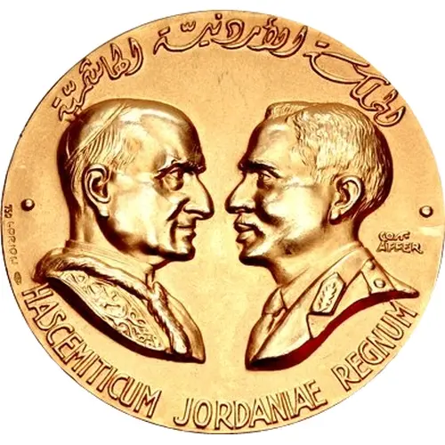 | توضیحات روی مدال | Busts of Pope Paul VI, wearing zucchetto and mantum, and King Hussein bin Talal of Jordan, in civic attire, facing one another. Pellet to left and right. |