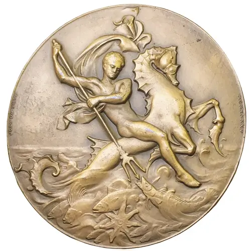 | Obverse description | Man wearing cape riding right on hippocampus holding a trident towards fishes in the ocean. |