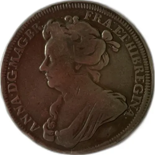 | Beschrijving keerzijde | Queen Anne is depicted as the goddess Pallas Athena, in armour and with a shield, holding aloft a thunderbolt and confronting a reclining monstrous figure with two heads, four arms and legs that end in multiple snake heads, and which threatens the goddess with clubs and stones |