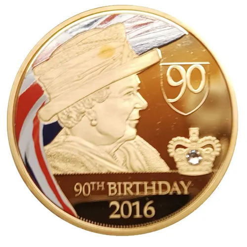 | Obverse description | Magnificently detailed portrait of Queen Elizabeth II with a swirling full-colour British flag and is accented with a brilliant Swarovski crystal on the crown |