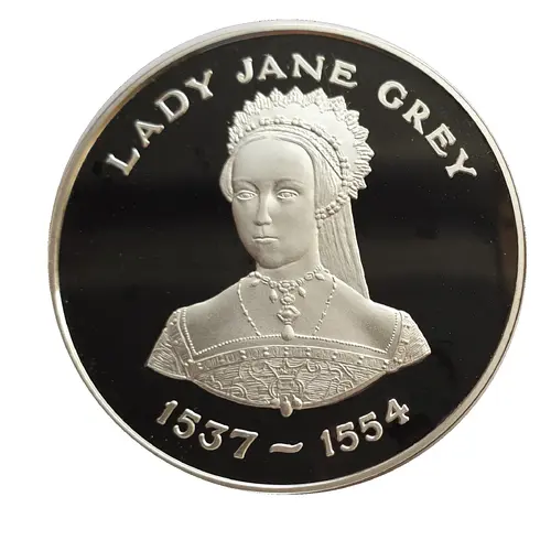 | Obverse description | Lady Jane Grey looking left, wearing Tiara and Necklace, with years of Birth and Death below. |