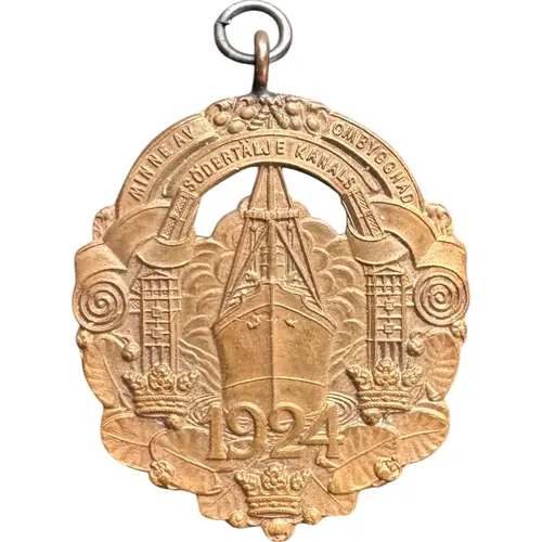 | 表面の説明 | Large ship navigating a narrow waterway, likely a canal or lock, with stylized waves around it. Flanking the ship are structures resembling lock gates or towers, the three Swedish crowns over leaves surround the date. |