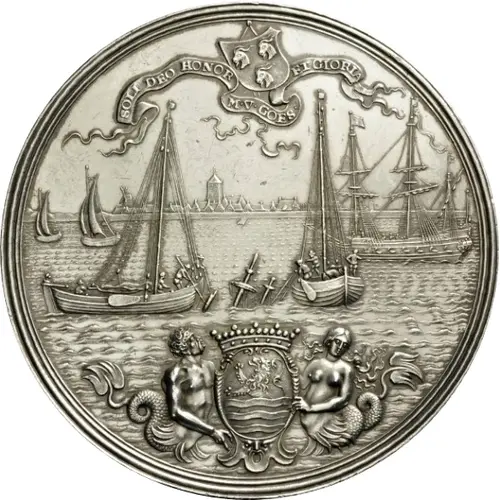 | Reverse lettering | In memoriam rei / Quâ arte admirandâ / priorumq/3 faeculorum cogitata / fuperante, prope Valacros in ple / no ac aeftuanti mari, fub aufpiciis / Senatus Zelandici ac procuranti / Marcel. Goefio e navi submersâ ac / disruptâ profundumq/3 fub arenis la= / titante immenfa argenti, tum rudis / tum signati, vis, gemme plures, ac / tormenta bellica, fubducta, ser= / vata ac veteribus dominis / ex jure reftituta funt / 1660 (Translation: a memorial of how, by an admirable art, surpassing the inventions of past centuries, under the auspices of the Deputy Councillors of Zeeland and under the direction of Marcellus van der Goes, a great quantity of coined and bullion silver, many precious stones and many cannon were raised up near Walcheren, from a vessel lost, destroyed and sunk in the sands, and then returned to their proper owners) |