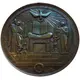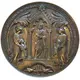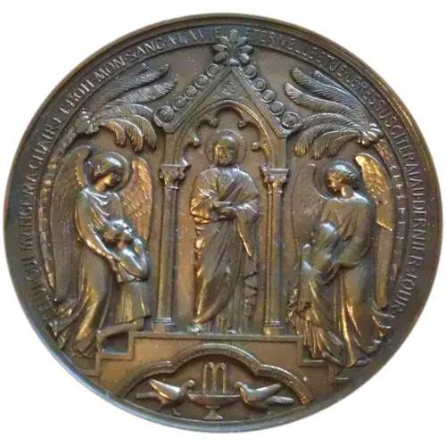 Christ standing frontally under a gothic arch, presenting communion to two kneeling children accompanied by two angels, followed on either side by a coconut tree; in the exergue two doves quenching their thirst in a fountain. |