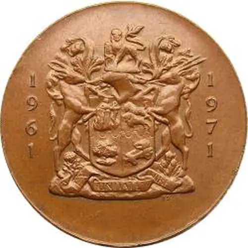 | Obverse description | Coat of arms of the Republic of South Africa. To the left running vertically downwards: “1961, and to the right: “1971”. Signed: “T S” below right. |