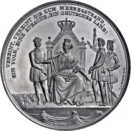 | Ön yüz açıklaması | Country goddess (maybe symbolizing Kiel, city center of the riot movements that wanted the Schleswig-Holstein to entry in the German Confederation) enthroned between three armed students |