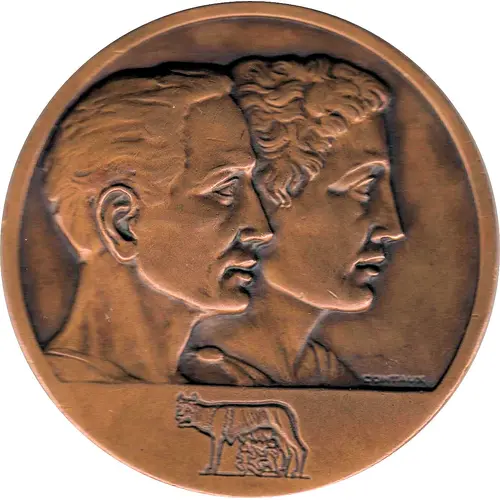 | Obverse description | Heads to the right of Romulus and Remus, below the she-wolf. |