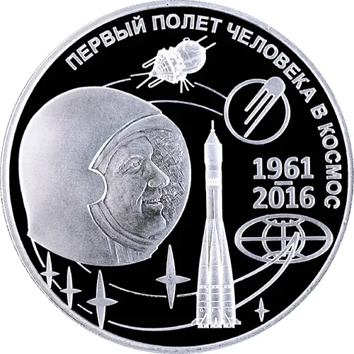 | Obverse lettering | ПЕРВЫЙ ПОЛЕТ ЧЕЛОВЕКА В КОСМОС 1961-2016 (Translation: THE FIRST HUMAN FLIGHT INTO SPACE 1961-2016) |