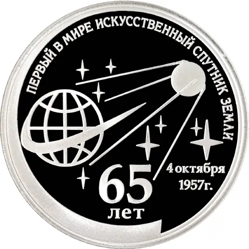 | Obverse lettering | ПЕРВЫЙ В МИРЕ ИСКУССТВЕННЫЙ СПУТНИК ЗЕМЛИ 4 октября 1957г. 65 лет (Translation: THE WORLD`S FIRST ARTIFICIAL EARTH SATELLITE October 4, 1957 65th Anniversary) |