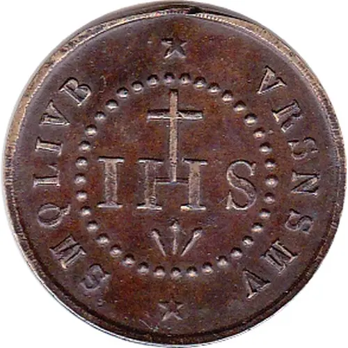 | Obverse description | V R S N S M V : Vade Retro Satana, Numquam Suade mihi Vana : S M Q L I V B : Sunt Mala Quae Libas, Ipse Venenum Bibas : |