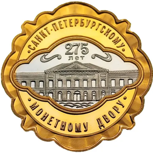 | Obverse lettering | САНКТ-ПЕТЕРБУРГСКОМУ МОНЕТНОМУ ДВОРУ 275 лет (Translation: SAINT PETERSBURG MINT 275 years) |