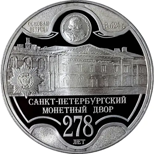 | Obverse lettering | Основан Петром I в 1724г. САНКТ-ПЕТЕРБУРГСКИЙ МОНЕТНЫЙ ДВОР 278 лет (Translation: Founded by Peter I in 1724 SAINT PETERSBURG MINT 278 years) |