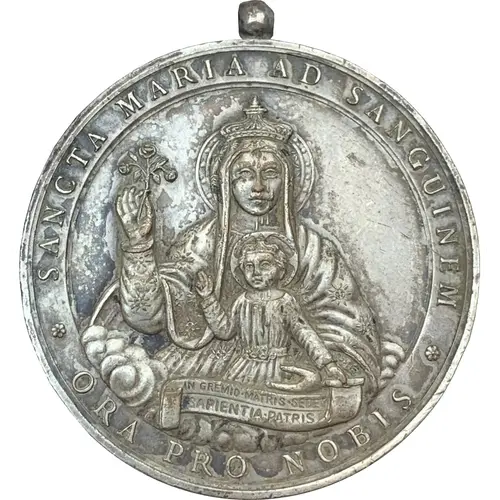 | Obverse lettering | SANCTA MARIA AD SANGUINEM * ORA PRO NOBIS * IN GREMIO MATRIS SEDET // SAPIENTIA PATRIS |