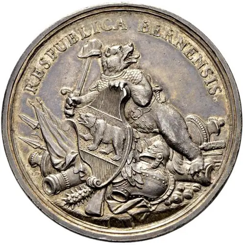 Bernese coat of arms held by a bear with a sword and a hat of freedom. War trophies at its feet. |