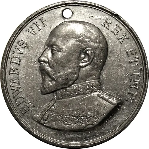 A seated and draped female figure facing left, holding a corn stalk in her right hand, at her feet an overflowing cornucopia and her left hand is supporting a shield. In the centre of the shield there is a quartered, circular design, having the coat-of-arms of the territories comprising the union, the Cape Colony, the Transvaal Republic, the Orange Free State and the Colony of Natal, in each quadrant. The background of the shield is the British Union Jack which encroaches and obscures the arms of the Transvaal. Behind the female there is a radiant sun and, on the left, mine headgear and a man tilling a field with an ox-drawn plough. Inscription around the perimeter, date in the exergue, and the maker`s name on the exergue line. |