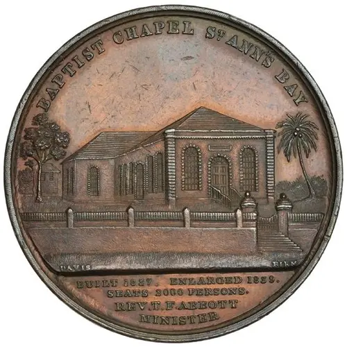 | Obverse lettering | BAPTIST CHAPEL ST. ANN`S BAY DAVIS BIRM BUILT 1837. ENLARGED 1839. SEATS 2000 PERSONS. REV.T.F.ABBOTT MINISTER |