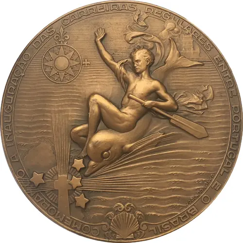 | Obverse description | Man with paddle riding on a dolphin, Portugal at upper right and Brazil at lower left. |