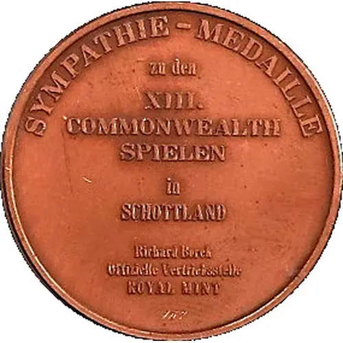 | Obverse lettering | SYMPATHIE-MEDAILLE zu den XIII. COMMONWEALTH SPIELEN in SCHOTTLAND Richard Borch Offizielle Vertriebsstelle ROYAL MINT |