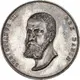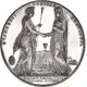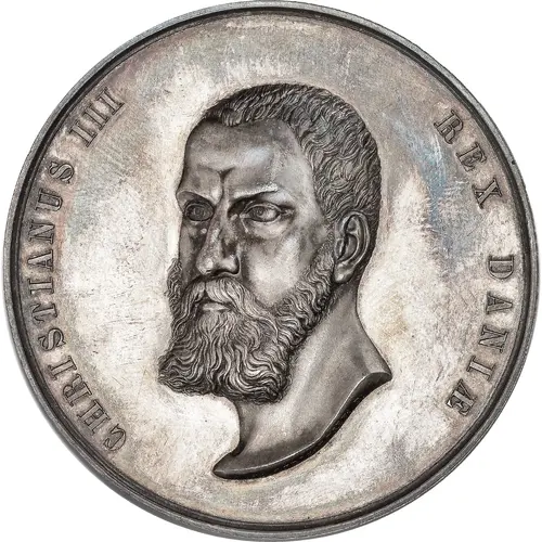 Two veiled female figures shake hands above altar with a cup above. Left laureate figure represents Denmark (thanks to the small Danish shield placed near her legs) and has a long staff in left hand; right capped figure represents Religion (small swan at right of her legs, symbol of purity) and holds a Bible in left arm, near her brest. Two lines of text with date anniversary in exergue. |