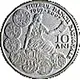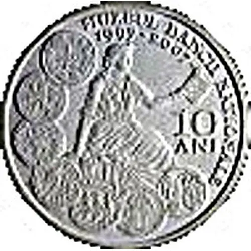 In the middle, Clio the muse of history, on the outer ring, on the left side and at the bottom, 7 old coins: a Hystrian drachma, a sestertius issued by Trajan, a Koson, a Wallachian 5 dinar issued by Vladislav I, a Moldavian gros issued by Petru I Muşat, a lion-thaler and a leu 1 coin (1870); on the right side, the inscriptions `MUZEUL BANCII NATIONALE 1997 - 2007` and `10 ANI`. |