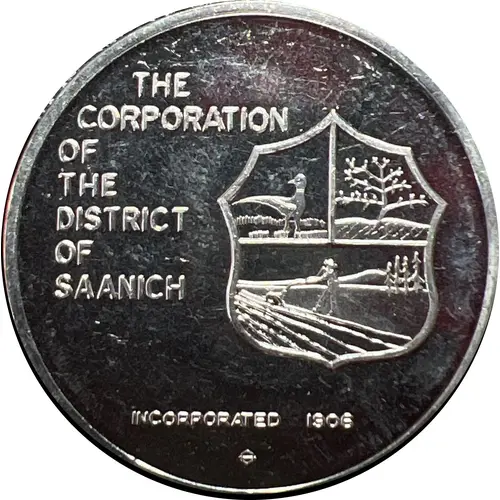| Obverse description | The municipal shield of Saanich to the right of center with the Title `THE CORPORATION OF THE DISTRICT OF SAANICH` to the left of center and the year of incorporation at the bottom |