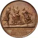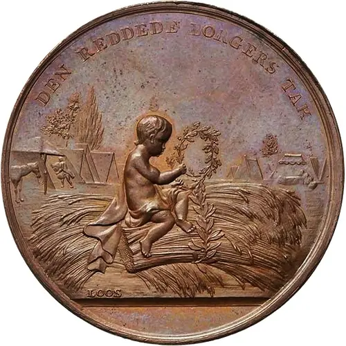 Veiled and armored female figure with towered crown (representing the City of Copenhagen) flees from burning palace to search the help of God Neptune. Neptune points left to the rescuer in Roman costume (Crown Prince Frederik). Five lines text below, in exergue. |