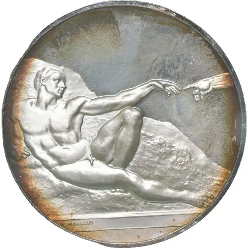 | Obverse description | Adam reclining on the rock extending his hand to touch the hand of the Creator. |
