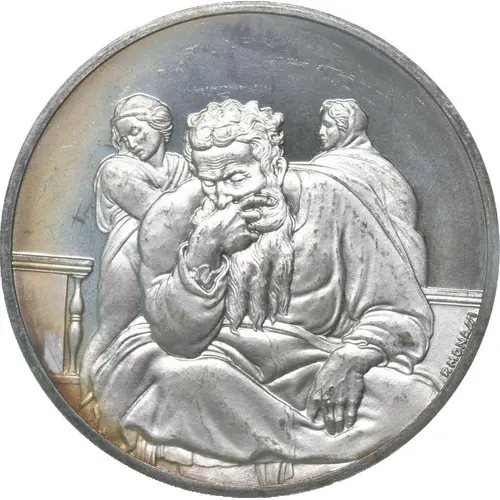 | Reverse description | Face of Michelangelo at center of star in geometric pattern, surrounded by legend text |