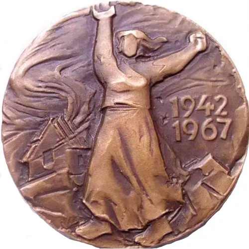 | Reverse description | Solitary Rose under raised letters. This rose of Lidice commemorates the 25th Anniversary of Massacre of the Village of Lidice. |