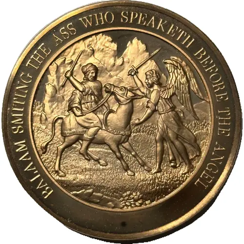 | Obverse lettering | BALAAM SMITING THE ASS WHO SPEAKETH BEFORE THE ANGEL |