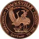 Townsville Casino top left, Outline of Magnetic Island top right, Townsville City skyline with mountain in background below, all in an inner circle. Text around in outer ring. |