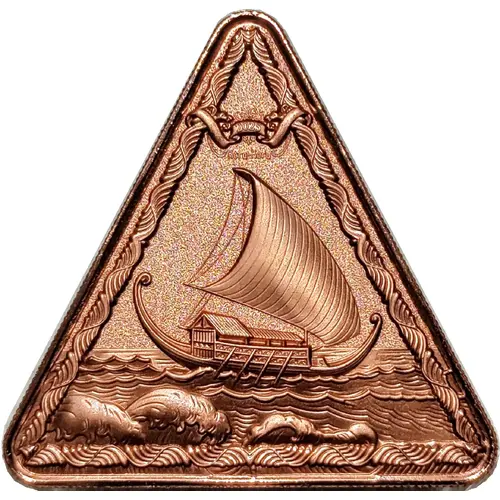 This triangular-shaped medal is struck from pure copper weighing 1 AVDP oz and features the theme of traditional maritime heritage from the Indonesian archipelago. The design showcases the Kora-Kora, a traditional warship from the Maluku Islands of Indonesia, with its large single sail billowing in the wind. The long, narrow hull with raised ends and outrigger paddles reflects the ship’s historic role in both warfare and ceremonial voyages. The ship sails across stylized waves, framed by intricate ornamental scrollwork. |