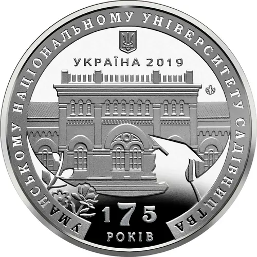 | Obverse description | On top, against a smooth background is Ukraine’s small coat of arms. Below is the legend УКРАЇНА 2019 (Ukraine 2019); in the middle is the university’s building, against the background of which is the smooth outline of a student (to the right), and plant images (to the left); against a matt background is the circular legend УМАНСЬКОМУ НАЦІОНАЛЬНОМУ УНІВЕРСИТЕТУ САДІВНИЦТВА (to the Uman National University of Horticulture); below, against a smooth backdrop is the legend 175/РОКІВ (175 years). The mint mark of the NBU Banknote Printing and Minting Works is above and to the right of the building. |