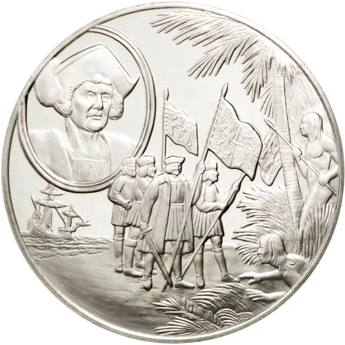 | Obverse description | Inset portrait of Italian navigator and explorer Christopher Columbus. Christopher Columbus and three members of the expedition disembark on the island of San Salvador under the gaze of the natives. The natives display the royal banner of Castile and Leon, as well as the expedition`s own flag. Ship in background. |