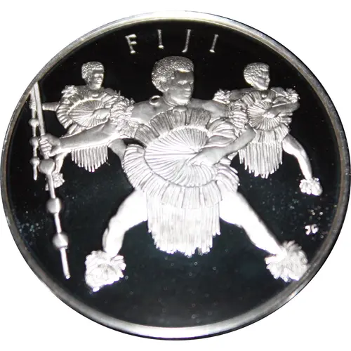 | Obverse description | Three Fijian warriors doing the spear and fan dance. |