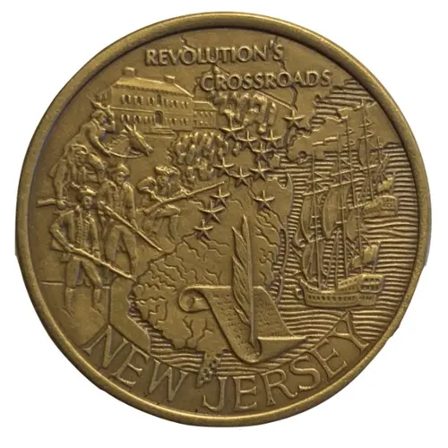 | Reverse description | Map of New Jersey with soldiers, boats, a building and the declaration of independence. |