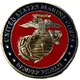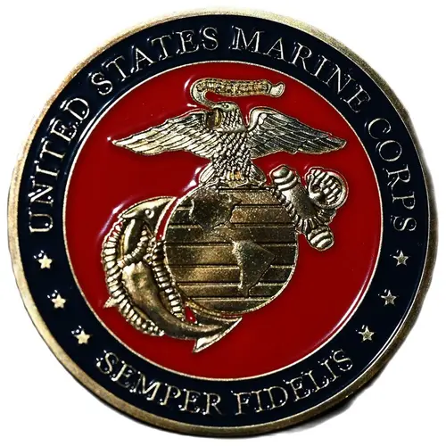 Colorized front with plated Eagle, Globe, and Anchor in center. Background red with blue ring around outside. Lettering along outside edge with three stars on both the left and right sides. |