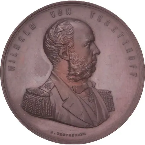 | نوشتههای پشت مدال | DEM VICE-ADMIRAL WILHELM VON TEGETTHOFF 1877 GLORREICH SIEGE BEI LISSA ERWARB ER UNSTERBLICHEN NUHM SICH UND OESTERREICHS SEEMACHT TAPFER KÄMPFEN BEI HELGOLAND |