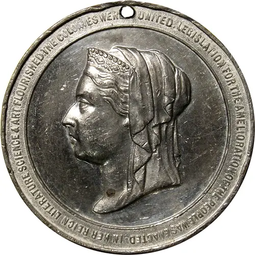 | Obverse lettering | IN HER REIGN LITERATURE SCIENCE & ART FLOURISHED. THE COLONIES WERE UNITED. LEGISLATION FOR THE AMELIORATION OF THE PEOPLE WAS ENACTED |