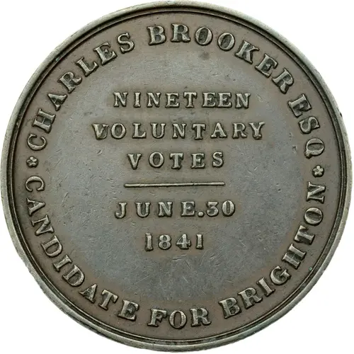 | Obverse lettering | CHARLES BROOKER ESQ NINETEEN VOLUNTARY VOTES JUNE.30 1841 CANDIDATE FOR BRIGHTON |
