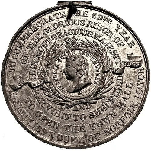 VICTORIA QUEEN AND EMPRESS ✠ TO COMMEMORATE THE 60TH YEAR OF THE GLORIOUS REIGN OF HER MOST GRACIOUS MAJESTY GOD SAVE THE QUEEN HER VISIT TO SHEFFIELD TO OPEN THE TOWN HALL MAY 21ST 1897,DUKE OF NORFOLK MAYOR |