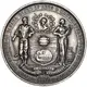 | Obverse description | Shield of arms flanked by standing figures of Industry and Art |