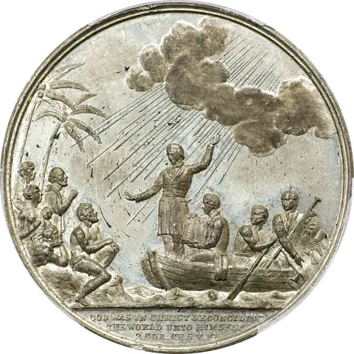 | Obverse description | Missionaries in longboat left, preaching to natives to left; sun`s rays shine through the clouds above |