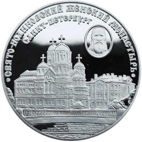 | Aversbeschreibung | The obverse of the coin Russia 3 rubles 2002 St. John`s Convent in St. Petersburg made of silver is used. It depicts a panorama of the architectural monuments of the St. John`s Convent in St. Petersburg, on the right in an oval is a portrait of the archpriest, `People`s Saint` John of Kronstadt. |