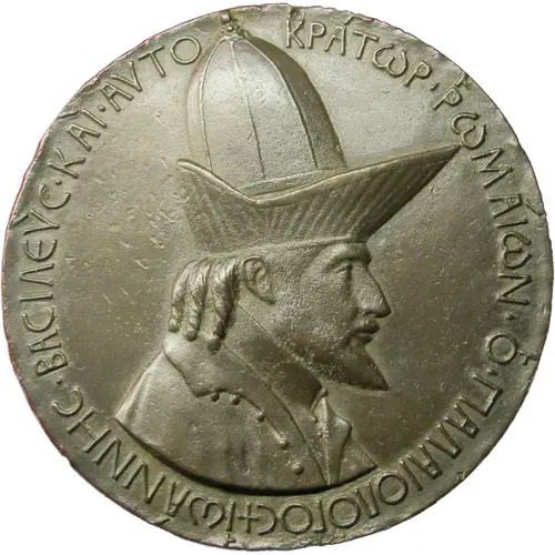 | Obverse description | Bust of Byzantine Emperor John VIII Palaiologos facing right, with corkscrew curls, pointed beard, wearing high-necked shirt, open jacket, and extravagant domed hat. |