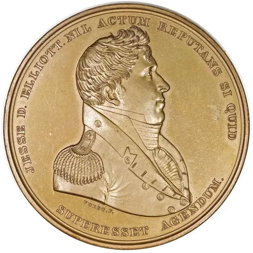 | Obverse lettering | JESSE D. ELLIOTT, NIL ACTUM REPUTANS SI QUID SUPERESSET AGENDUM (Translation: Jesse D. Elliott, considering nothing to have been done, if aught remains to be accomplished`), FURST F. at truncation (small diagonal raised die line visible nearby).) |