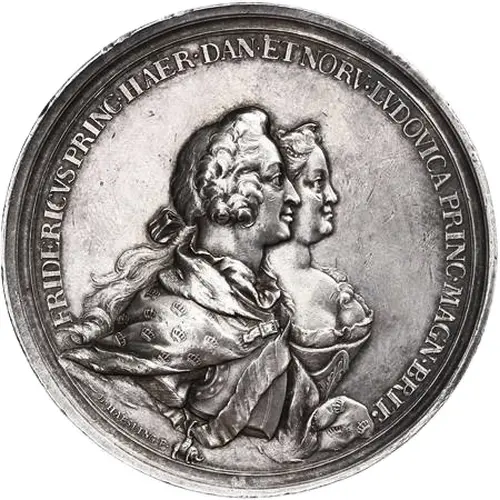 FRIDERICVS.PRINC.HAER.DAN.ET.NORV.LVDOVICA.PRINC.MAGN.BRIT. (Translation: Frederick hereditary prince of Denmark and Norway, Louise Princess of Great Britain) |